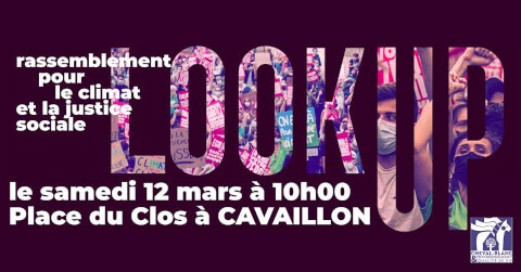 MARCHE LOOK UP- Pour le climat et la justice sociale - 12 MARS · CAVAILLON Les seul·es à pouvoir répondre à la crise climatique et sociale, les seul·es à pouvoir enclencher le changement majeur dont nous avons besoin, c’est nous. Le 12 mars, rendez-vous dans la rue à Cavaillon ! #MarcheLookUp En janvier 2022, le film Don’t Look Up dressait un parallèle évident et glaçant avec le dérèglement climatique et ses conséquences catastrophiques sur nos vies. Il a ainsi permis de remettre dans le débat public plusieurs enjeux majeurs : l’urgence climatique est désormais indéniable mais au lieu de regarder la vérité en face et de prendre des décisions nos responsables détournent trop souvent le regard. Ensemble nous avons le pouvoir d'agir. Nous devons rappeler l’ordre des priorités et faire de 2022 l’année où la France a pris le chemin d’un avenir juste et soutenable pour toutes et tous. Nous ne pouvons pas attendre 5 ans de plus. Nous pouvons faire en sorte de changer nos vies maintenant. Nous pouvons bâtir un avenir plus juste pour toutes et tous. Nous pouvons demander des comptes aux responsables. 👉 Le samedi 12 mars, marche Look Up de CAVAILLON ➡ Des marches ont lieu partout en France. Plus d’infos ici : https://marcheclimat.fr/12mars/